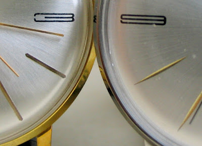 Wskazówki współczesne koloru złotego także są identyczne z oryginalnymi. Jedynie sekundnik minimalnie dłuższy. Czarne są wyraźnie grubsze.